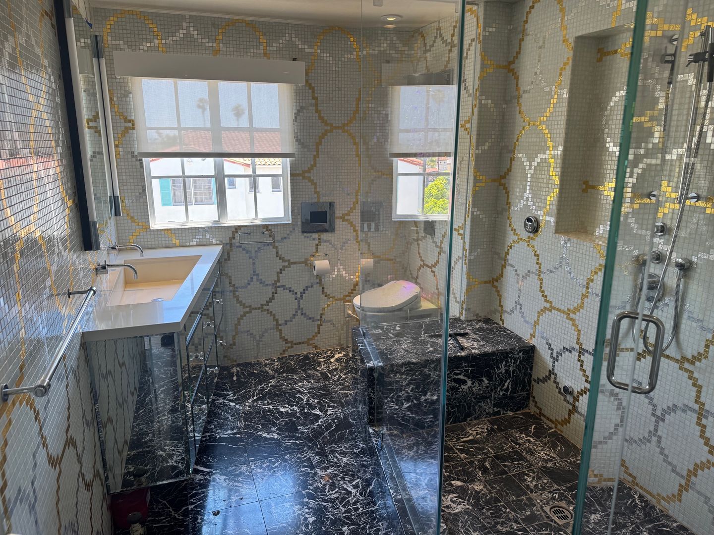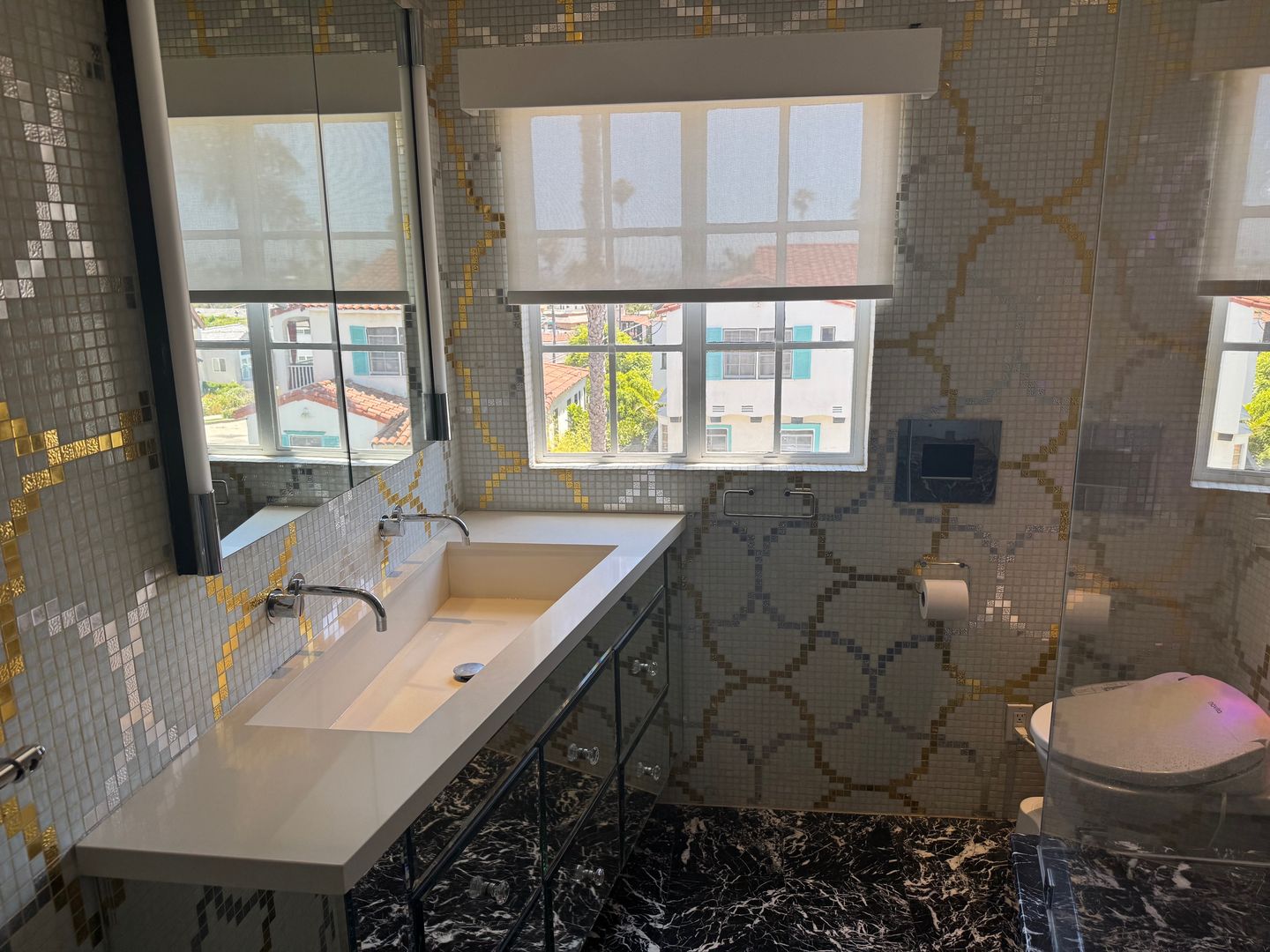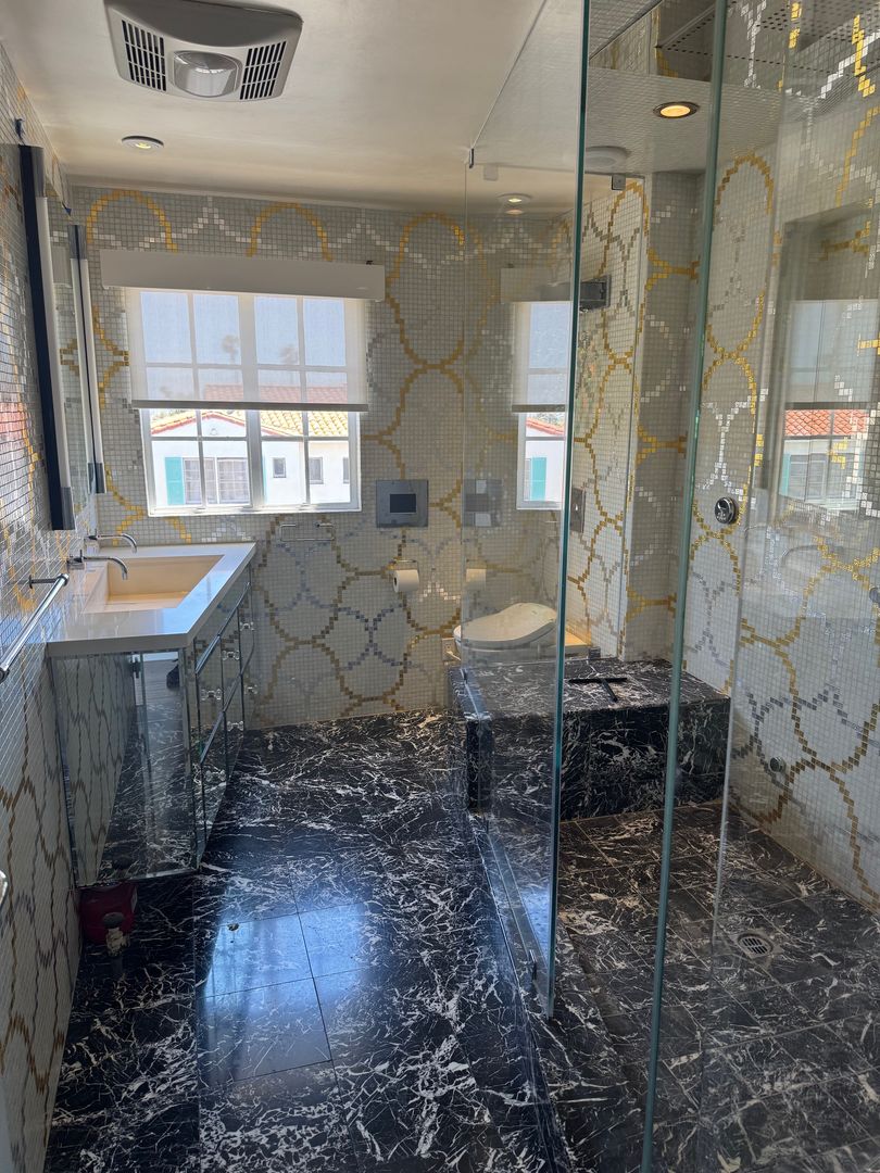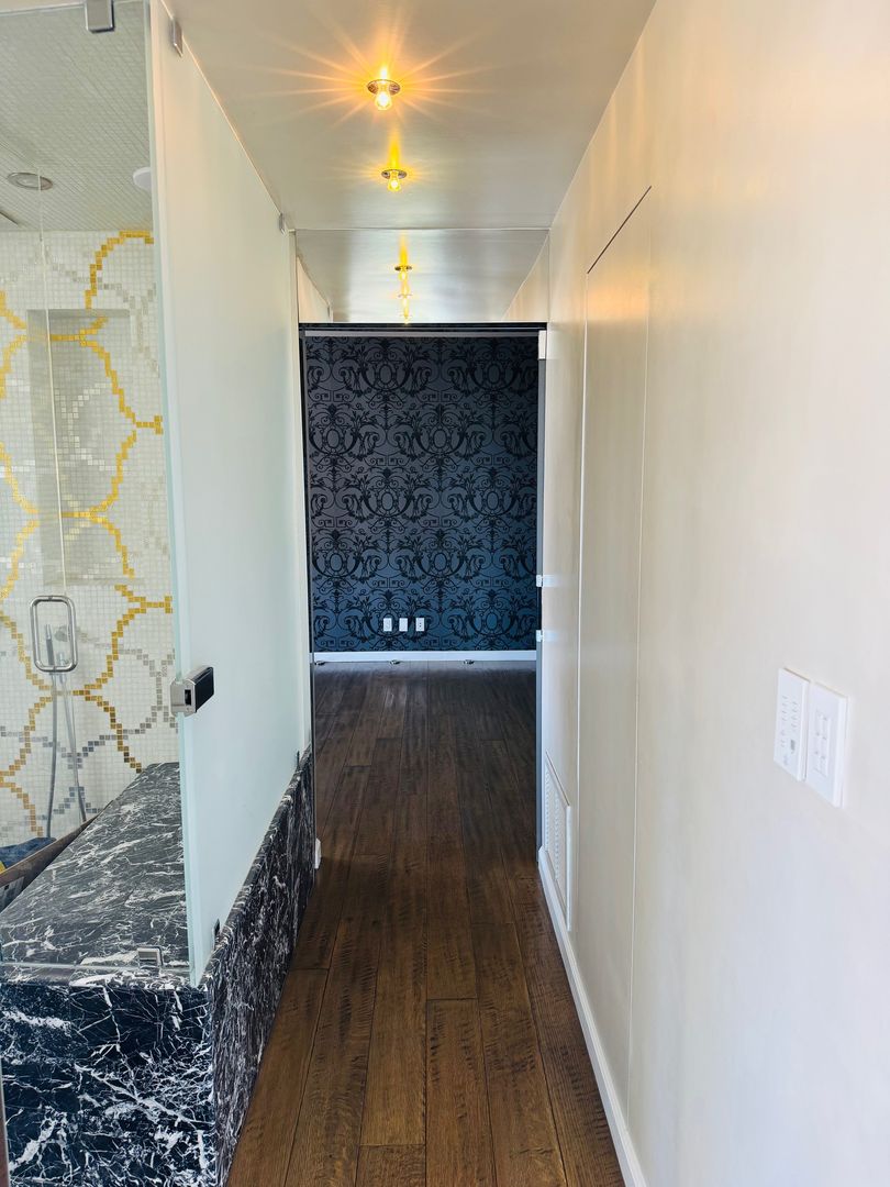 The residence is fully outfitted with an in-unit washer and dryer for convenience, and every room is wired with a built-in wall speaker system, creating a seamless audio experience throughout the home. Indulge in the spa-like ambiance of the expansive walk-in steam shower, offering the ultimate in daily relaxation. The bedroom features custom California closet system. The apartment offers central air & heat, and all windows have automatic blinds easily raised or lowered with a touch of a button.