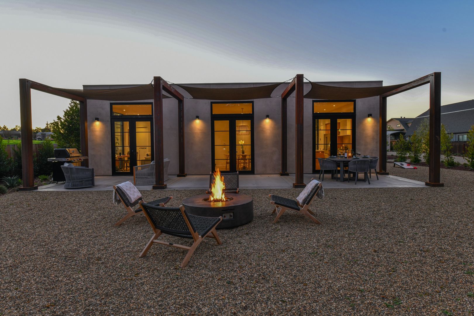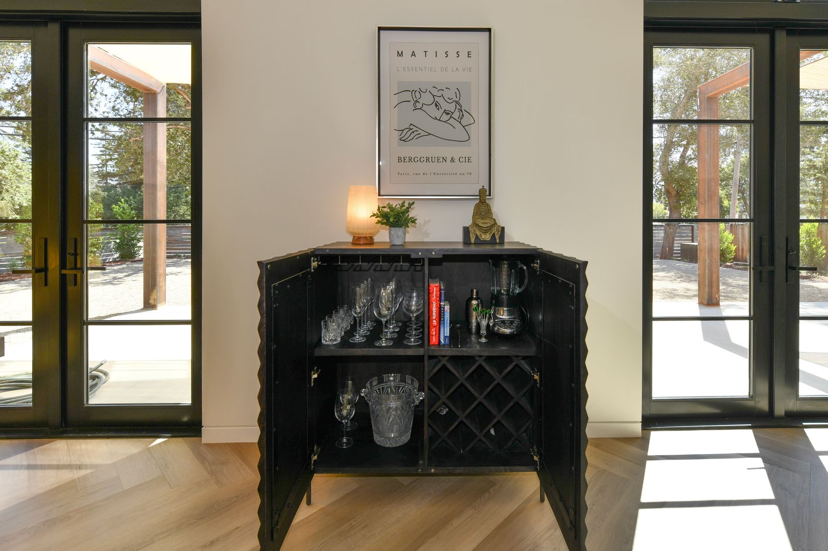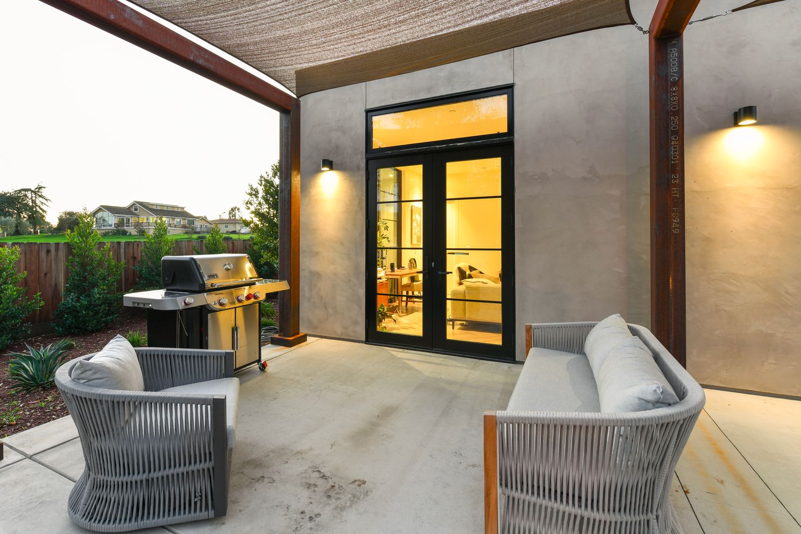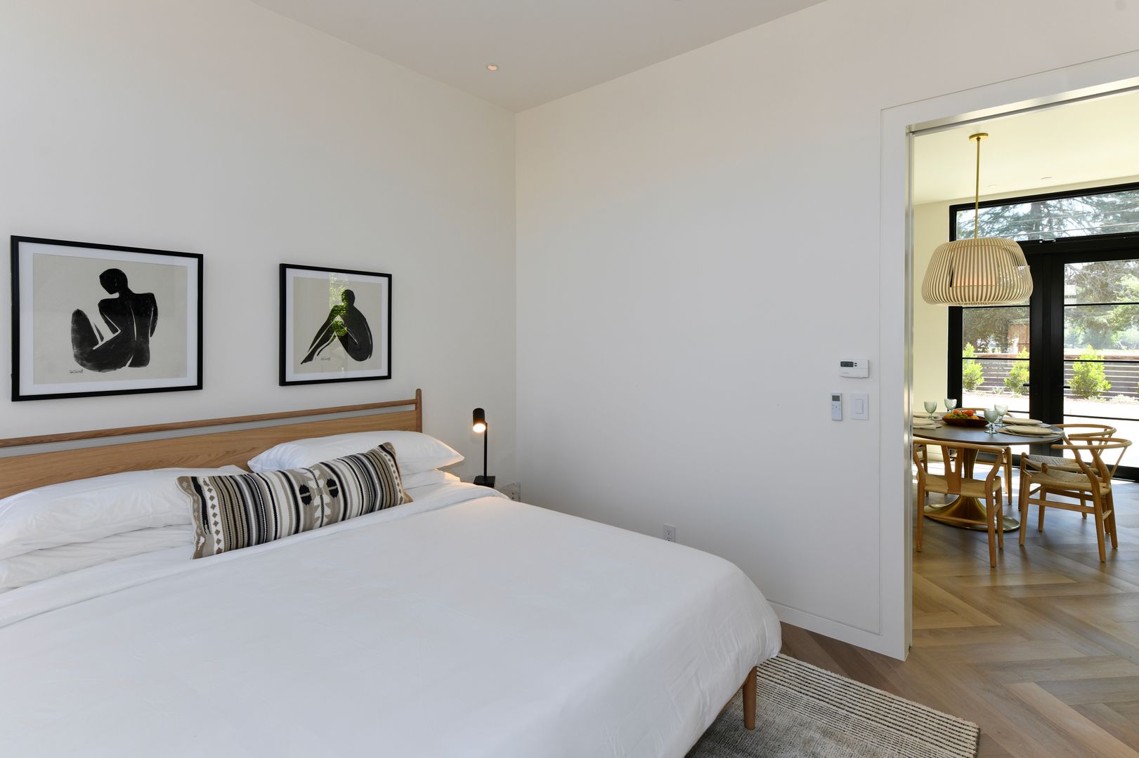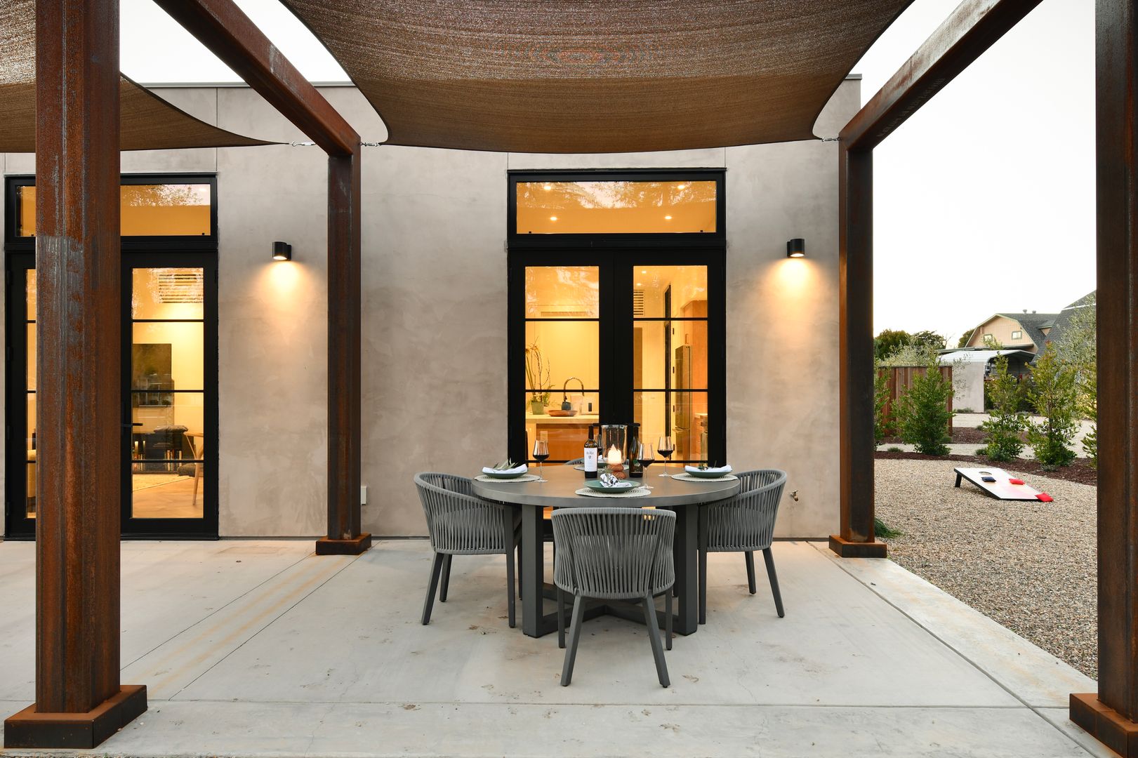 The sunlit living area welcomes you each morning with a warm and inviting atmosphere. Multiple sets of French doors open to an expansive private patio complete with dining table, lounge seating, BBQ, and firepit - ideal for alfresco dining or relaxing under the Napa stars.