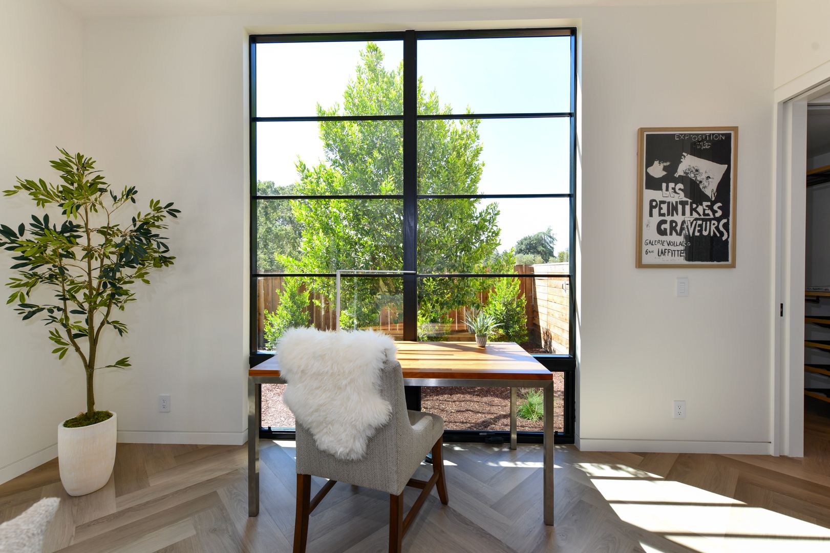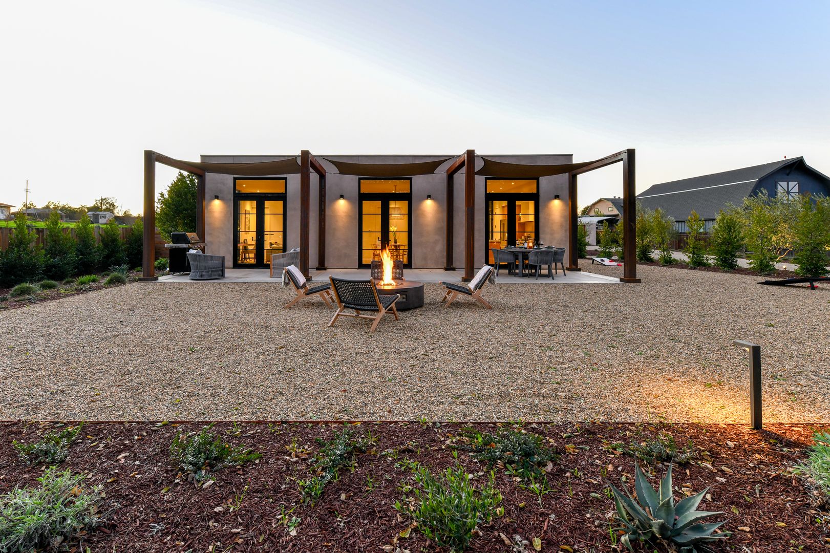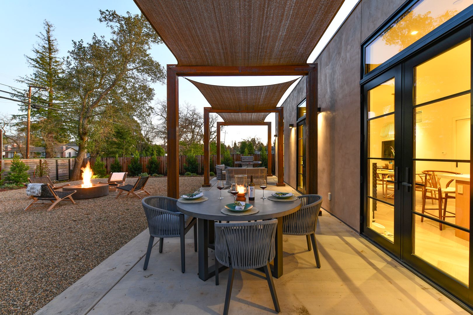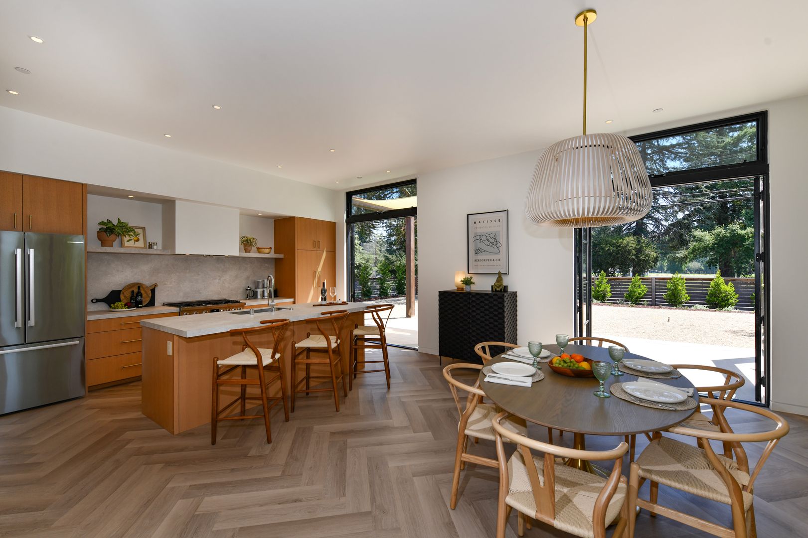 The sunlit living area welcomes you each morning with a warm and inviting atmosphere. Multiple sets of French doors open to an expansive private patio complete with dining table, lounge seating, BBQ, and firepit - ideal for alfresco dining or relaxing under the Napa stars.